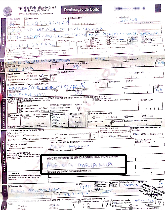 A Declaração de Óbito de Francisco Aristide de Sousa Barbosa, conhecido como “Barruada”, de 47 anos, aponta asfixia mecânica como causa da morte. O caso é investigado pela Polícia Civil, que agora aguarda o laudo pericial e trabalha para ouvir testemunhas antes de indiciar o suspeito preso.