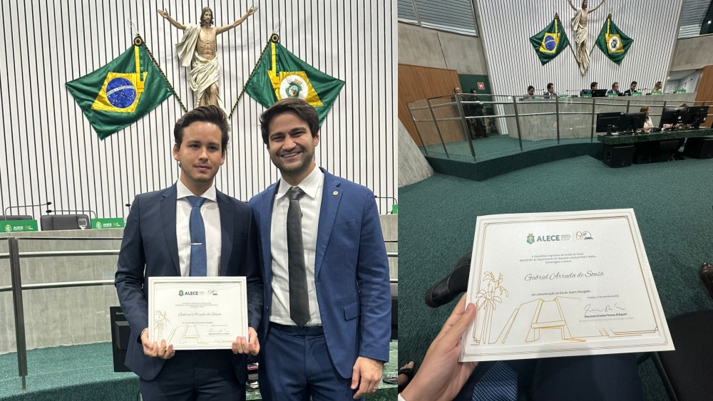 O jovem advogado Gabriel Arruda de Sousa, OAB/CE 53.503, foi homenageado pela Assembleia Legislativa do Ceará em comemoração ao Dia do Jovem Advogado. A homenagem reconhece a participação da nova geração de profissionais na advocacia cearense.